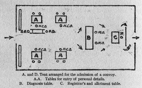 As the stretchers with patients, or the walking wounded, enter the admission tent, they are directed in order to one of four tables. At each is stationed a Sergeant with two orderlies. The Sergeant obtains the necessary particulars from the man when he can speak, or, if too ill to speak, from the card with which he had been tagged at the Dressing Station or Casualty Clearing Station – regimental number, name, age, unit, religion, and so on – and as each answer is obtained, he dictates it to the two orderlies. One inserts the particulars on the Hospital card, destined for the Registrar's Office, the other upon the Diet Sheet which accompanies the patient to the ward. These two documents accompany the patient to the diagnosis table, B, where are two or more Medical Officers, who make the provisional diagnosis which determines whether the patient is to be treated as a medical, surgical or special case. So soon as this has been made and entered on the documents, the patient passes to the final table, C, that of the Registrar, who has before him a plan or list of beds vacant in the different wards, and promptly assigns him to his particular bed in a particular ward. The Hospital card is left here, the Diet Sheet accompanies the man to the ward. Without delay the man is carried or led to the ward. There he finds waiting in a bundle pyjamas, dressing-gown, and all necessary belongings. Whenever possible, the next phase is that these are carried by him to the bath. There the Service clothes are left, and, clean and in hospital attire, the man is ready to enjoy his rest between sheets. Stretcher cases are without delay undressed by orderlies and put to bed.