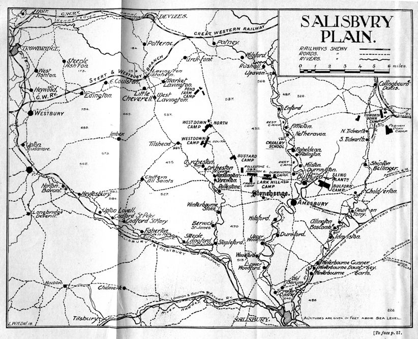 The rolling downs, devoid of fields and fences and the diminishing population, make this an ideal ground for camps and army manoeuvers and exercises, and as such they have of late years been employed by the British Army. There is a pre-war cavalry school at Netheravon, and the least populated district to the north has been employed for artillery, with heavy gun and other ranges. It was in this area that the Canadians were camped.