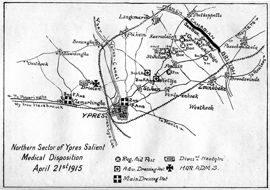 The medical units accompanying the First Contingent were the following: No. 1 Canadian Field Ambulance, O.C. Lieutenant-Colonel A. E. Ross (of Kingston, Ontario); No. 2 Canadian Field Ambulance, O.C. Lieutenant-Colonel D. W. McPherson (of Toronto); No. 3 Canadian Field Ambulance, O.C. Lieutenant-Colonel W. L. Watt (of Winnipeg); No. 1 Canadian Casualty Clearing Station, O.C. Lieutenant-Colonel F. S. C. Ford (of New Germany, N.S.); No. 1 Canadian General Hospital, O.C. Lieutenant-Colonel Murray MacLaren (of St. John, N.B.); No. 2 Canadian General Hospital, O.C. Lieutenant-Colonel J. W. Bridges, P.A.M.C.; No. 1 Canadian Stationary Hospital, O.C. Lieutenant-Colonel L. Drum, P.A.M.C.; No. 2 Canadian Stationary Hospital, O.C. Lieutenant-Colonel A. T. Shillington (Ottawa).